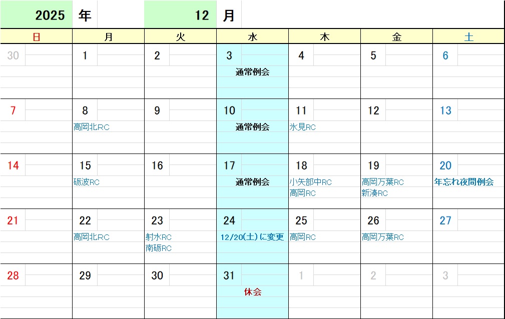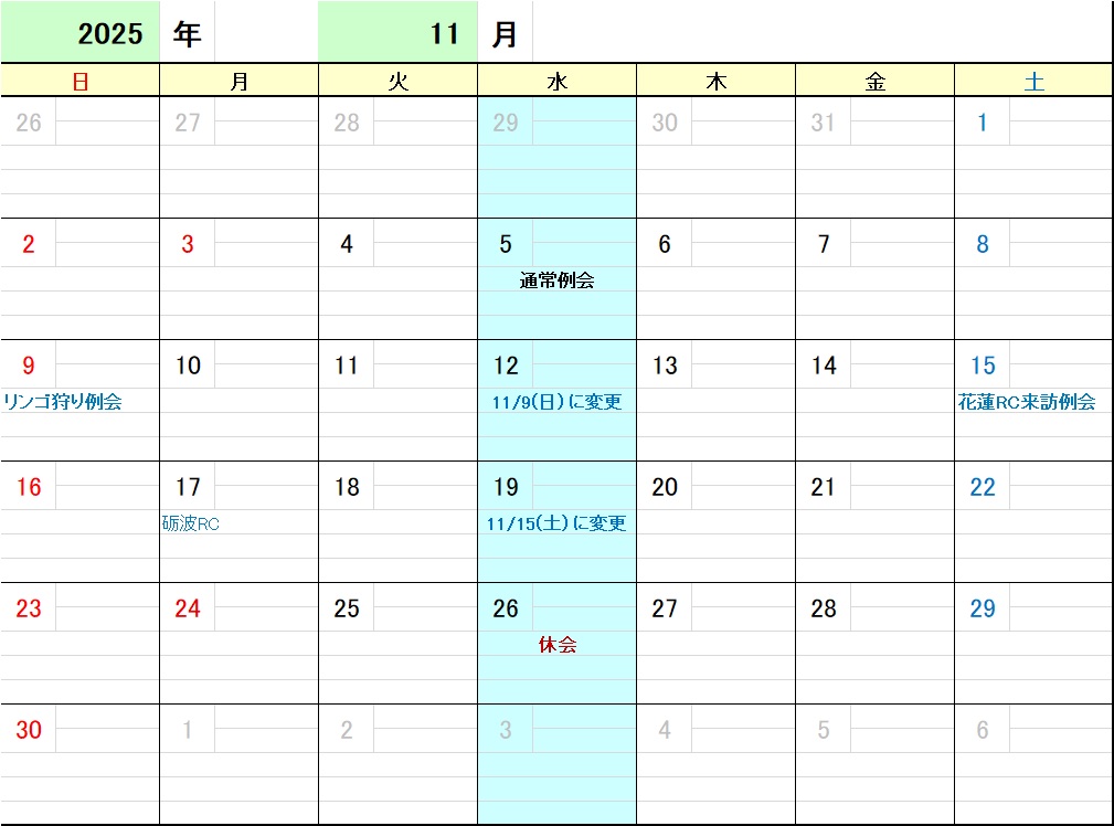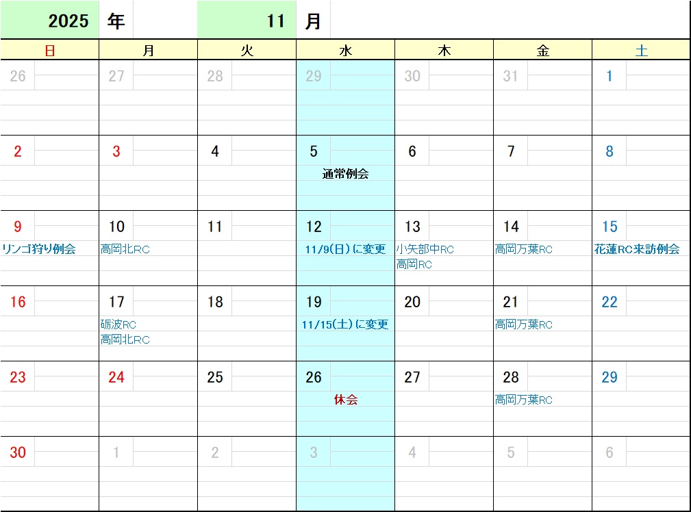 - 青色で掲載されているクラブは受付のみ。 ▲は例会取消or受付なし